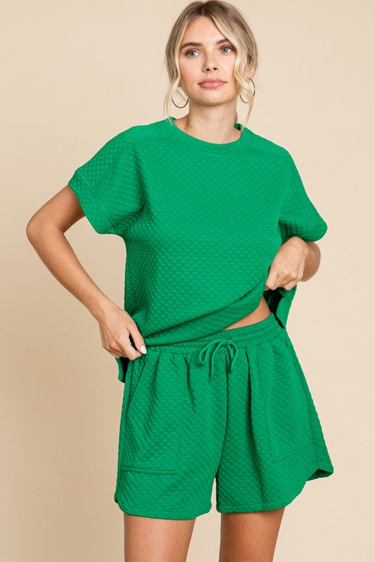 Textured drawstring shorts with pockets. Very comfy and a relaxed fit.