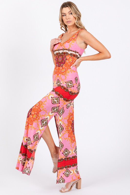 Pink,orange,red print fitted dress with two side slits.