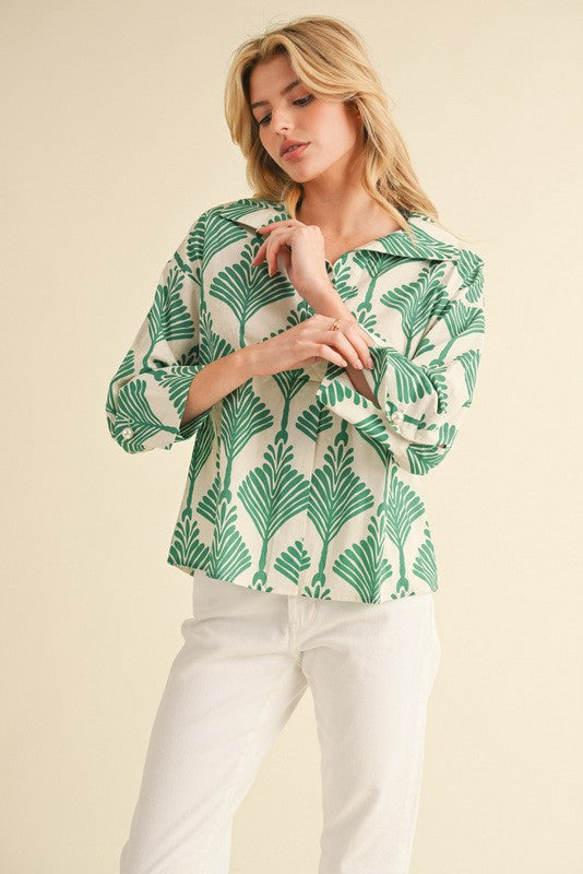 Green print top with open wide collared neck with pearl button closure, 3/4 sleeves and pearl buttons on cuffs.