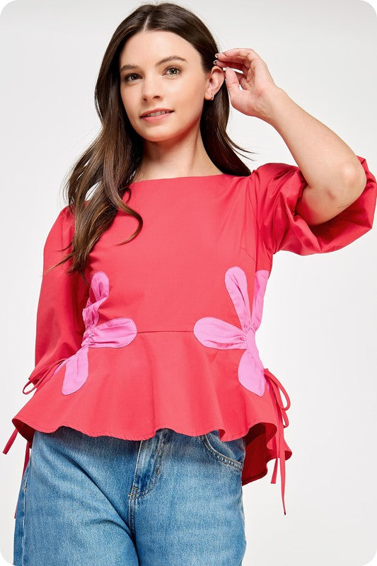 This cotton top has puff sleeves and a patchwork flower detail on the sides and a cinched waist with a peplum and back zipper.