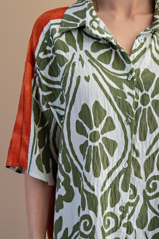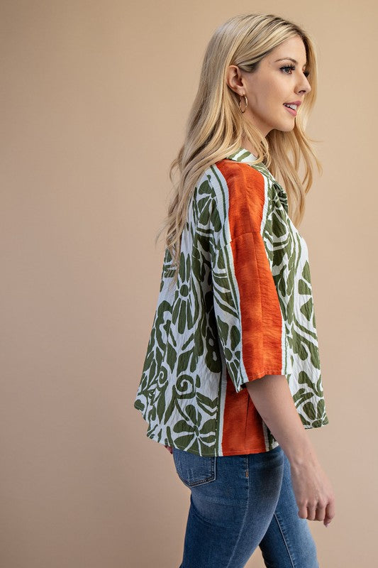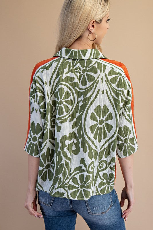 Olive green and rust orange button front top.