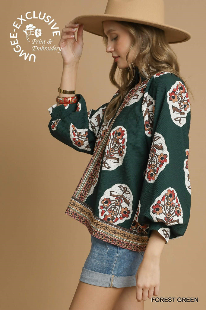 Beautiful print top with bubble sleeves.